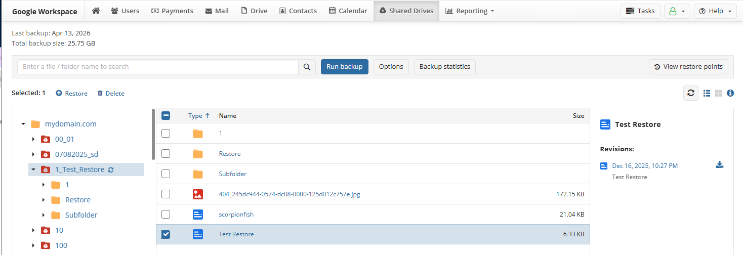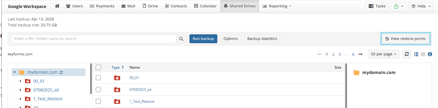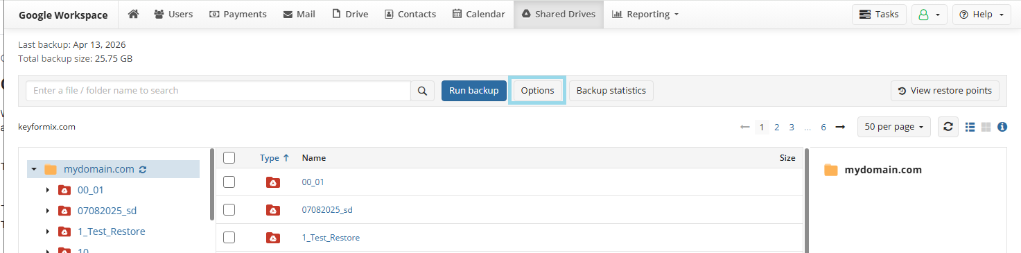 Once the initial backup is completed, you can view a list of backed up items. Shared Drives backup is performed twice per day automatically.