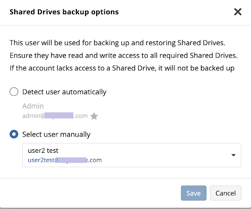 - Save your selection. The selected admin account will be used for all subsequent Shared Drive backups.
