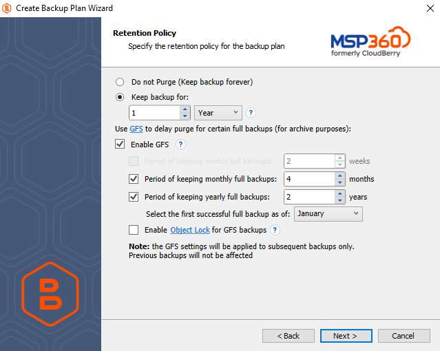 Once the Object Lock for GFS backups feature is enabled on the required storage account, proceed to create or edit the backup plans that require immutable data.