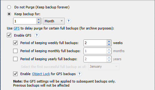 For example, if in GFS settings you enable weekly and monthly keeping periods with 2 weeks and 2 months of keeping backups accordingly and then enable immutability, it means that all weekly and monthly backups selected by the GFS keeping period assignment mechanism will be locked on backup storage and cannot be deleted with Backup Agent.