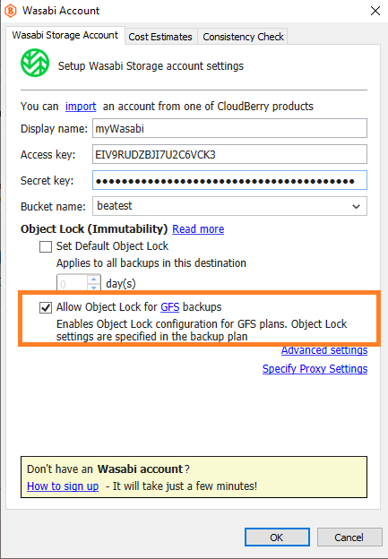 First, make sure your storage account supports the Object Lock (Immutability). Currently, Immutability is supported for Amazon S3, Wasabi, Backblaze B2 and IDrive e2.