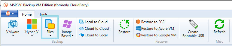To create a new file backup plan, click the Files icon in the horizontal menu bar.